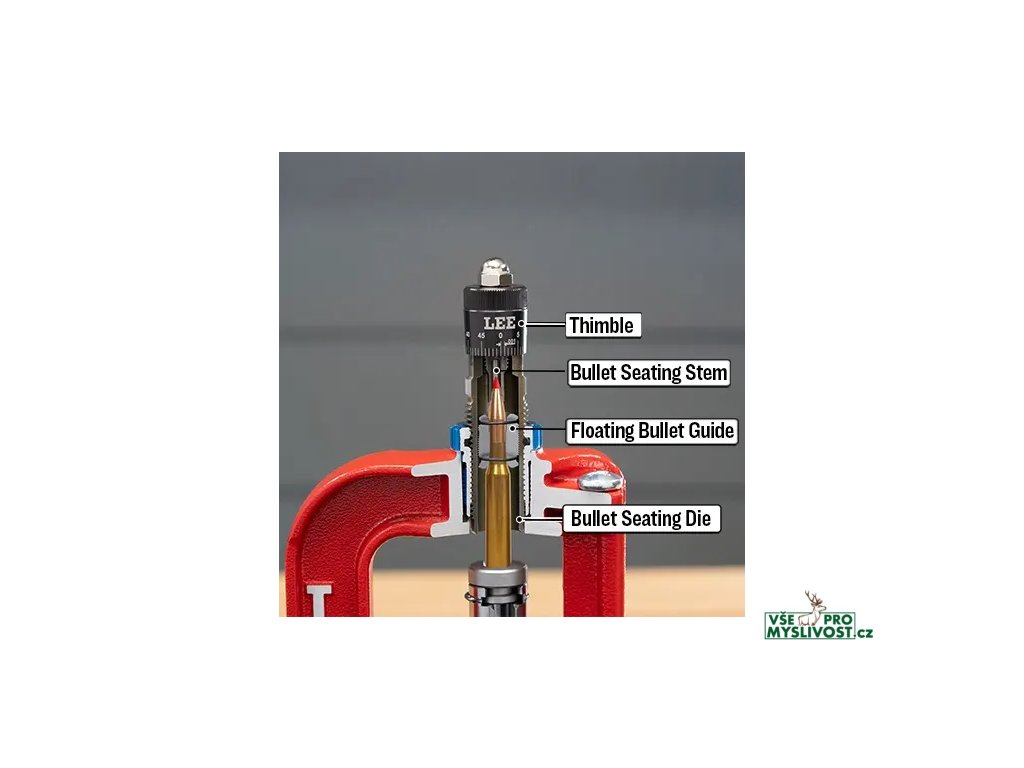 MIKROMETRICKÁ USAZOVACÍ MATRICE (Micrometer Bullet Seating Die) je určena pro precizní přebíjení nábojů. Díky mikrometrické hlavě s laserově gravírovanou stupnicí umožňuje přesnou regulaci hloubky usazení střely s přesností na tisícinu palce – stejně jako u špičkových mikrometrů. Tělo matrice je navrženo jako tzv. Dead length seating die, takže matrice dosedá na shell holder, což zaručuje přesnou a jednotnou hloubku usazení střely při každém cyklu. Klíčovým prvkem je plovoucí vodítko střely (Floating Bullet Guide), které zajišťuje, aby hrdlo nábojnice a střela byly během usazování vedeny v dokonalé ose. Tento díl má radiální vůli, která umožňuje ideální vycentrování vodítka i nábojnice vůči usazovacímu šroubu. Usazovací dřík (Bullet seating stem) je precizně obráběný a leštěný tak, aby nedocházelo k poškození ani k otlačení střely – bez ohledu na její tvar. Plovoucí vodítko střely je oboustranné – po jeho vyšroubování a otočení umožňuje matrice současné usazení střely a zalisování krčku nábojnice (seating + crimping) – jedinečná funkce, kterou nabízí pouze značka Lee.