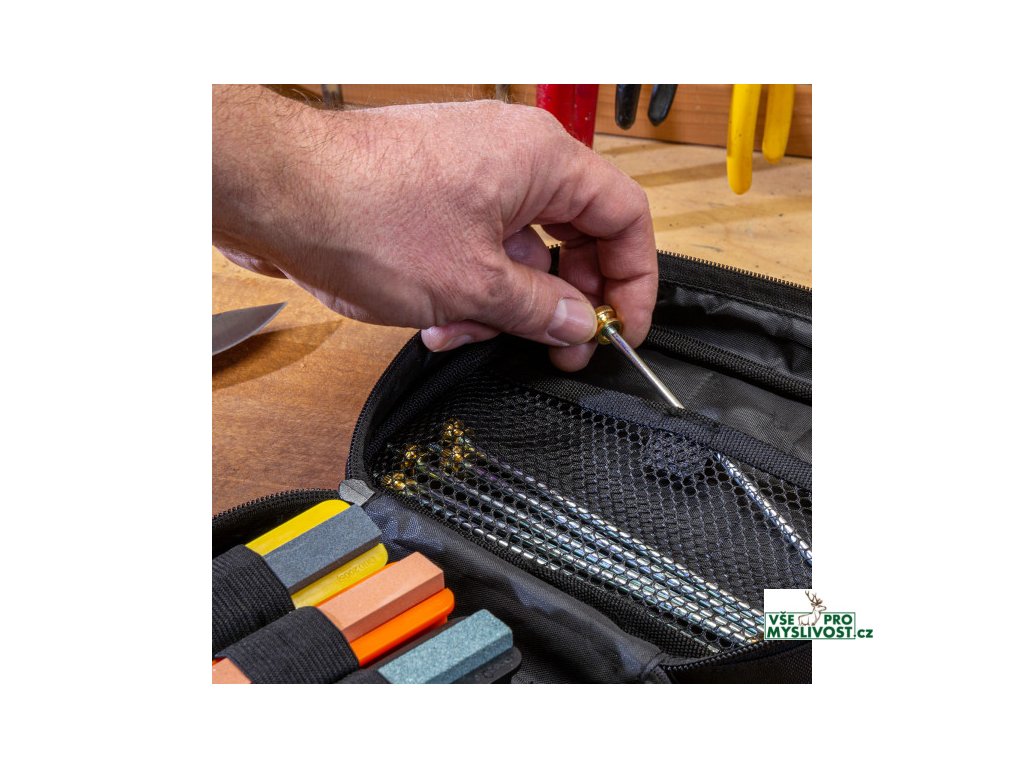 Systém pro přesné broušení nožů Smith se 6 kameny umožňuje snadné broušení všech typů nožů. VČETNĚ ZOUBKOVANÝCH. Díky látkovému úložnému pouzdru je tato sada přenosná a snadno skladovatelná. ½ palce široké kameny umožňují bezpečné, rychlé a snadné broušení. Sada se dodává s brusnými kameny zrnitosti 70 (černý), zrnitosti 120 (žlutý), zrnitosti 280 (zelený), zrnitosti 600 (oranžový), zrnitosti 1 000 (červený) a jemným keramickým kamenem trojúhelníkového tvaru pro zoubkované ostří. Sada navíc obsahuje roztok na broušení Premium.
