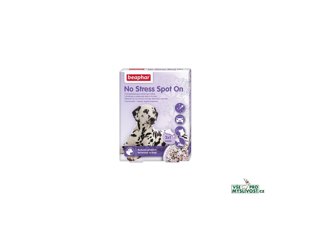 Beaphar No Stress Spot On je vhodný pro všechna plemena a věkové kategorie psů. Snižuje stres u psů a udržuje je v klidu díky zklidňujícímu účinku extraktu kozlíku lékařského, který je obsažen v mikrokapslích. Ty fungují na principu pomalého uvolňování a dlouhodobého účinku.Používá se v případě nadměrného štěkání nebo kňučení v důsledku úzkosti z odloučení, návštěvy veterináře, při cestování, bouřce nebo ohňostroji či v případě destruktivního nebo nežádoucího územního chování.
