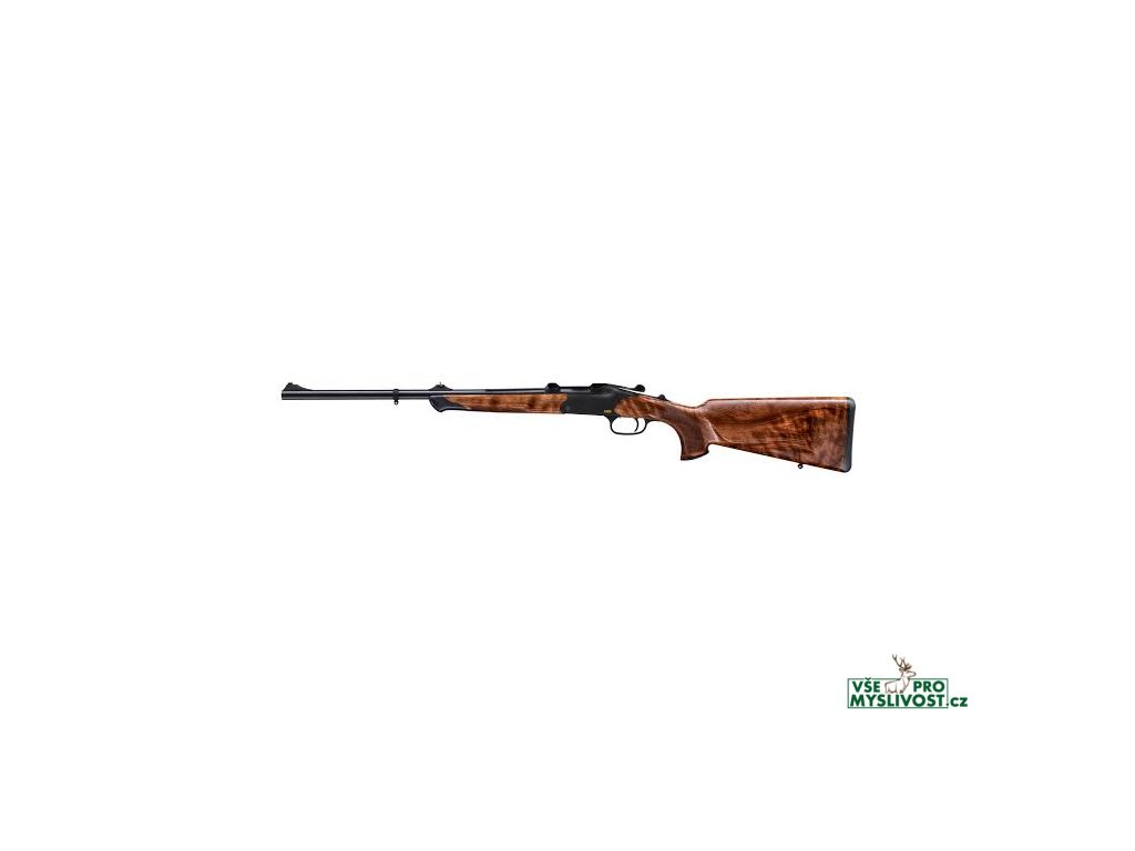 ořechové dřevo kvality 3, rovný hřbet pažby, dvojitá bavorská lícnice, staroanglická pryžová botka, tulipánovité rozšíření zakončení předpažbí, ozdobné zakončení tmavým ebenovým dřevem, černé boční desky systému, černá spoušť