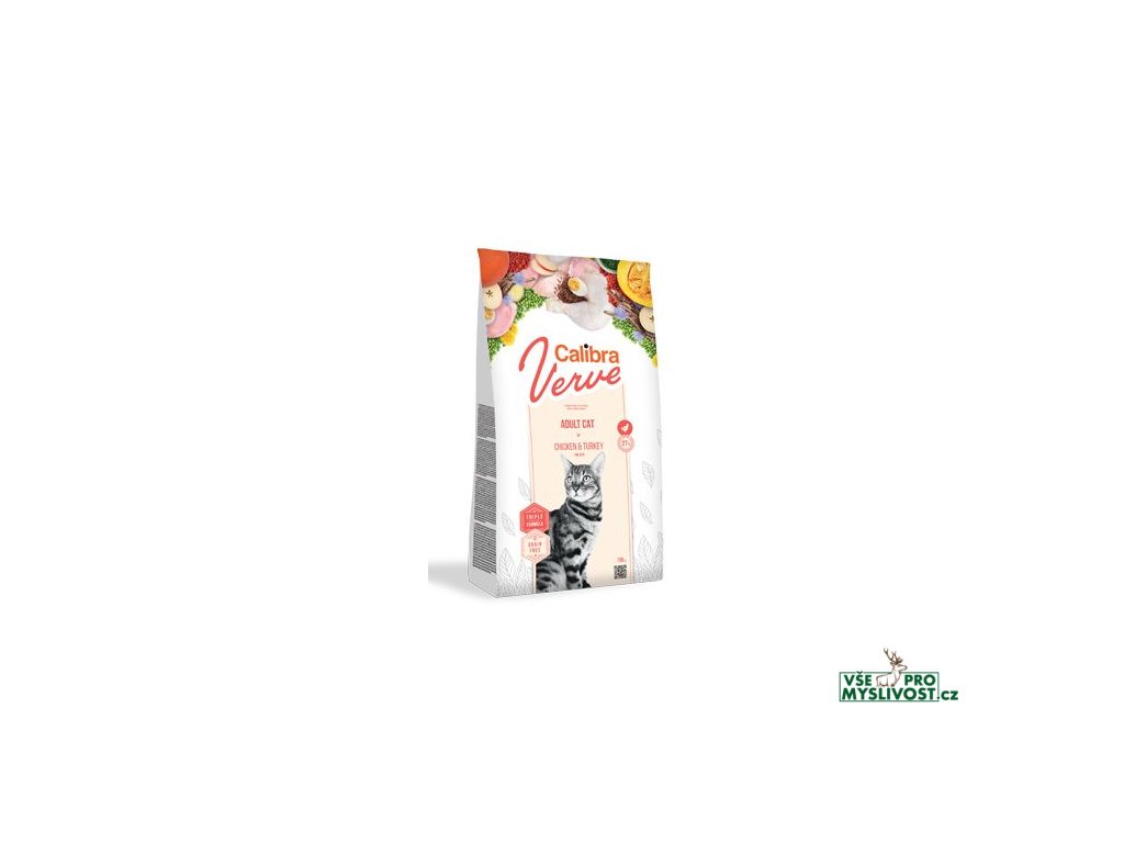 Calibra Cat Verve Adult Chicken & Turkey je kompletní krmivo bez obilovin s vysokým obsahem čerstvého masa – s kuřetem a krůtou. Receptura je určená pro dospělé kočky.Čerstvé maso z kuřete tvoří 27 % celkového obsahu. Proteiny v receptuře jsou z 90 % živočišného původu. Krmivo tak představuje vysoce výživnou porci, která je pro kočku jako masožravce zároveň lehce stravitelná. Křupavá a nadýchaná konzistence granulí je zároveň neodolatelným lákadlem.
