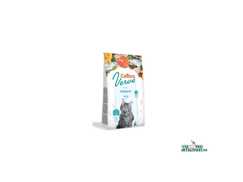 Calibra Cat Verve Sterilised Herring je kompletní krmivo bez obilovin s vysokým obsahem čerstvého rybího masa. Receptura je určená pro sterilizované a kastrované kočky.Čerstvé maso ze sledě a z lososa tvoří 29 % celkového obsahu. Proteiny v receptuře jsou ze 75,4 % živočišného původu. Krmivo tak představuje pro kočku jako masožravce vysoce výživnou porci. Takové granule jsou pro ni velmi atraktivní, protože respektují její přirozené stravovací instinkty. Zaujmou svou vůní a chutí a jsou zároveň lehce stravitelné. A jejich křupavá a nadýchaná konzistence je neodolatelným pokušením.
