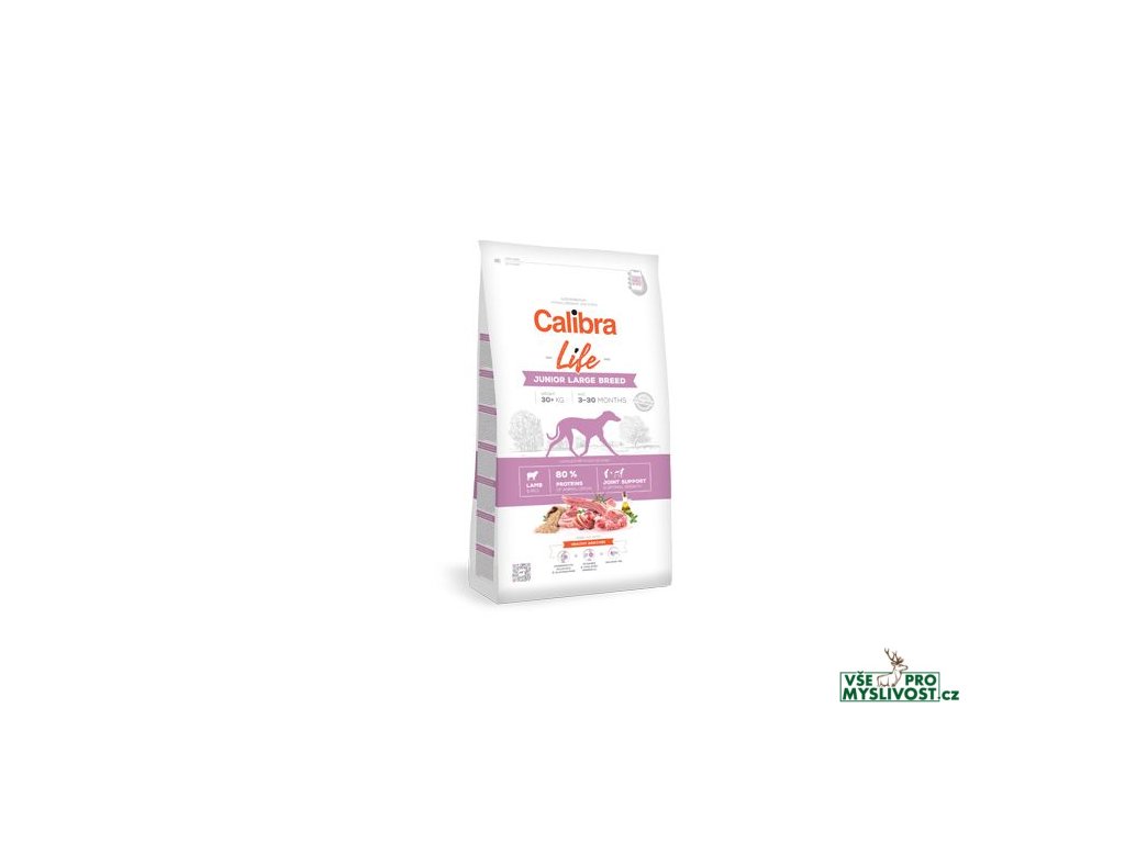 Calibra Dog Life Junior Large Breed Lamb jsou granule pro mladé psy (3–30 měsíců) velkých plemen (nad 30 kg) s jehněčím masem. Vyznačují se vysokou stravitelností, jsou hypoalergenní, velikost granulí je přizpůsobena fyziologickým potřebám velkých psů. Kvalitní proteiny, které jsou z 80 % živočišného původu, dodají dospívajícímu psovi potřebnou energii a dostatek živin pro jeho růst a vývoj. Receptura je sestavena jako monoproteinová - pouze jeden zdroj živočišných bílkovin. Jsou obsažena chondroprotektiva, která pomáhají pečovat o kloubní chrupavku namáhaných kloubů velkých plemen, a předchází tím problémům s klouby v dospělosti. Vitaminy a minerály přispívají k celkovému zdraví a posílení imunity. Lososový olej pomáhá pečovat o zdraví kůže a zářivou srst.Funkce hlavních aditiv