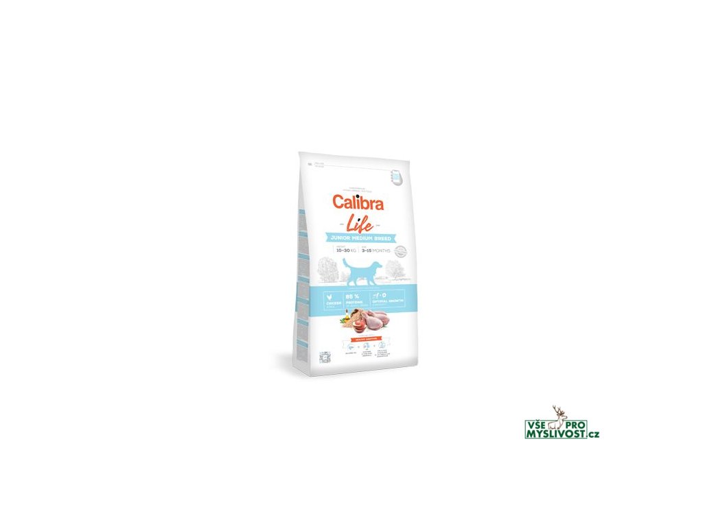 Calibra Dog Life Junior Medium Breed Chicken je hypoalergenní krmivo pro mladé psy (3–15 měsíců) středních plemen (10–30 kg) s kuřecím masem. O vysoké výživové hodnotě krmiva tolik potřebné pro správný růst psa vypovídá i obsah bílkovin živočišného původu. V této receptuře tvoří 85 % z celkového obsahu bílkovin. Receptura je sestavena jako monoproteinová - pouze jeden zdroj živočišných bílkovin. Granule jsou lehce stravitelné, s nízkým obsahem obilovin – pouze s rýží. Díky vysoce kvalitním surovinám a pečlivě vybraným aditivům mají příznivý vliv na růst a celkový vývoj psa. Přidali jsme prebiotika a probiotika pro zdravé zažívání a posílení imunitního systému, lososový olej pro péči o zdravou kůži a zářivou srst a vitaminy a minerály pro správnou funkci celého organismu.Funkce hlavních aditiv