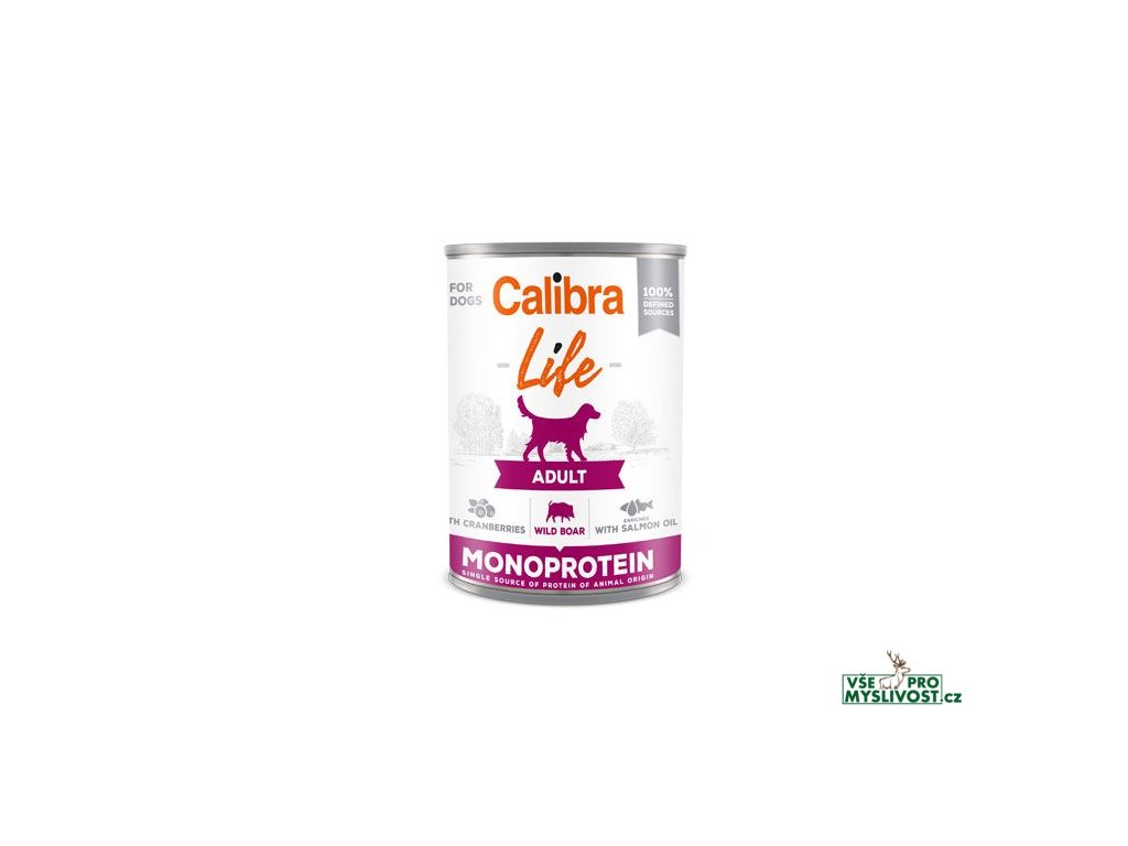 Calibra Dog Life Adult Wild Boar with Cranberries - receptura konzervy s kančím a brusinkami je kompletním krmivem, které je určené pro dospělé psy.Receptura je založena na jediném druhu proteinu, je sestavena z omezeného počtu ingrediencí. Složení konzervy je bez obilovin, bez lepku, obsahuje jen suroviny té nejvyšší kvality, které jsou ze 100% definovaných zdrojů, což má vliv na lehkou stravitelnost krmiva.