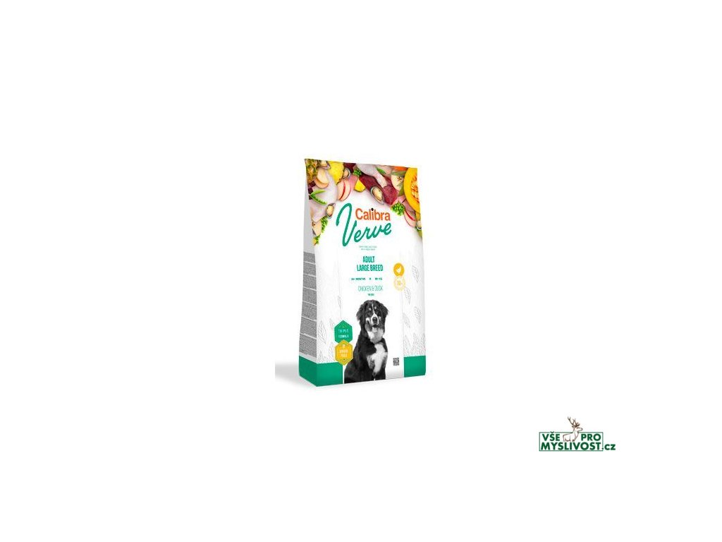 Calibra Dog Verve Adult Large Breed (Chicken & Duck) je kompletní suché krmivo s čerstvým masem a bez obilovin. Receptura je určena pro dospělé psy velkých plemen s hmotností nad 30 kg.30 % čerstvého kuřecího masa a kvalitní kachní protein zaručují psovi optimální dávku zdravé výživy. Krmivo odpovídá nejvyšším požadavkům na přirozené stravování psa v souladu s jeho fyziologickými potřebami.Čerstvé maso je vysoce výživným zdrojem bílkovin, který se vyznačuje atraktivní chutí, a je vhodné i pro citlivé zažívání.