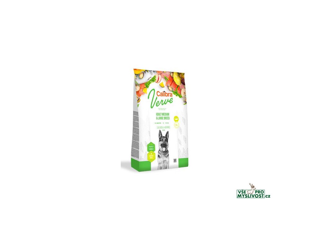 Calibra Dog Verve Adult Medium & Large Breed (Salmon & Herring) je kompletní suché krmivo s čerstvým masem a bez obilovin. Receptura je určená pro dospělé psy středních a velkých plemen s hmotností 10-90 kg.Krmivo obsahuje 30 % čerstvého masa z lososa a vysoký obsah kvalitních proteinů ze sledě. Krmivo odpovídá nejvyšším požadavkům na přirozené stravování psa v souladu s jeho fyziologickými potřebami a je zárukou jeho zdravé výživy.Čerstvé maso je vysoce výživným zdrojem bílkovin, který se vyznačuje atraktivní chutí, a je vhodné i pro citlivé zažívání.