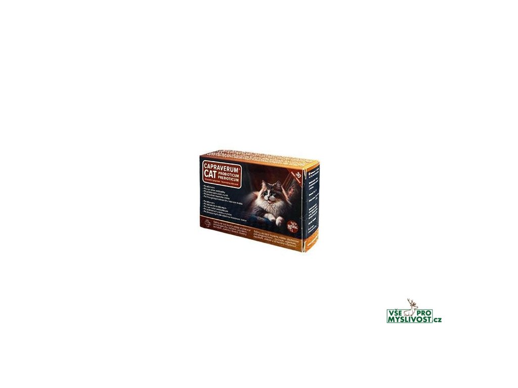 CAPRAVERUM CAT probioticum-prebioticum jsou tablety na bázi kozího mléka obohacené o všechny nejdůležitější vitamíny a užitečné mikroorganismy (Enterococcus faecium), inulin. Inulín je rozpustná fermentovatelná vláknina, která plní s kozím mlékem prebiotickou funkci a podporuje růst žádoucí střevní mikroflóry. Tablety mají optimální poměr kostitvorných minerálních látek - vápníku, fosforu, hořčíku a zinku, obsahují všechny esenciální aminokyseliny a lehko stravitelné tuky. Zlepšují stravitelnost živin z krmné dávky, působí příznivě na činnost trávicího traktu , jater a slinivky. Komplex mikroorganismů, vitamínů a zinku chrání trávicí trakt a kůži, podílí se na obraně organismu před infekcemi. Pomáhá obnovit zdravou střevní mikroflóru při léčbě antibiotiky a po jejím ukončení. Přispívá k prevenci a léčbě střevních onemocnění.Složení: sušené kozí mléko plnotučné, mastek, inulín, mikrokrystalická celulóza, vitamín A, vitamín D3, vitamín E, vitamín B1, vitamín B2, vitamín B6, niacin, biotin, kyselina pantothenová, vitamín B12, kyselina listová, vitamín C, cholin, inositol, L-Taurin, vápník, hořčík, zinek, mikroorganismy (Enterococcus faecium).Průměrná výživová hodnota veterinárního přípravku v tabletě o hmotnosti 0,6 g