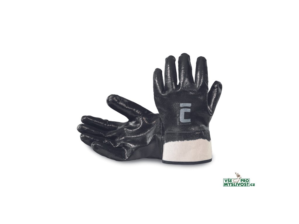• rukavice šité z bavlněného úpletu • celomáčané v černém nitrilu • pevná manžeta