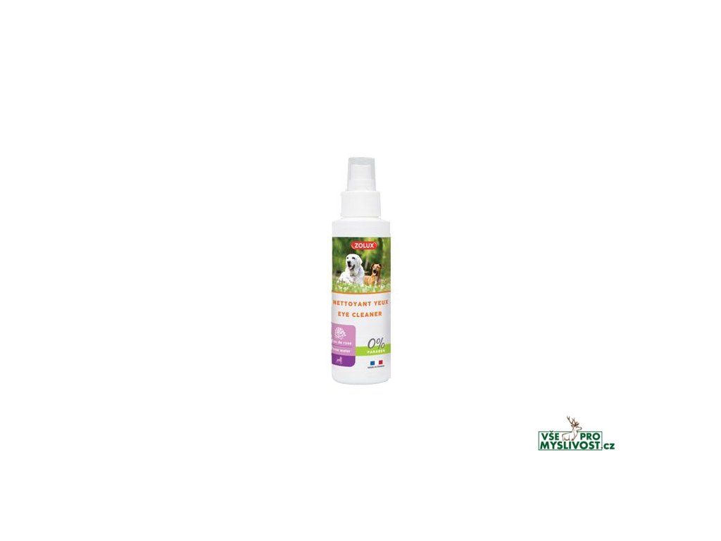 Oční sprej pro všechna plemena psů. Tento výrobek s růžovou vodou se používá k čištění očního okolí. Přípravek má antiseptický, čistící a uklidňující účinek, tlumí růst bakterií a omezuje slzení očí.Použití: sprej se doporučuje používat dvakrát týdně. Aplikuje se na vatu či tampon a jemně se vyčistí okolí oka. Neoplachuje se.