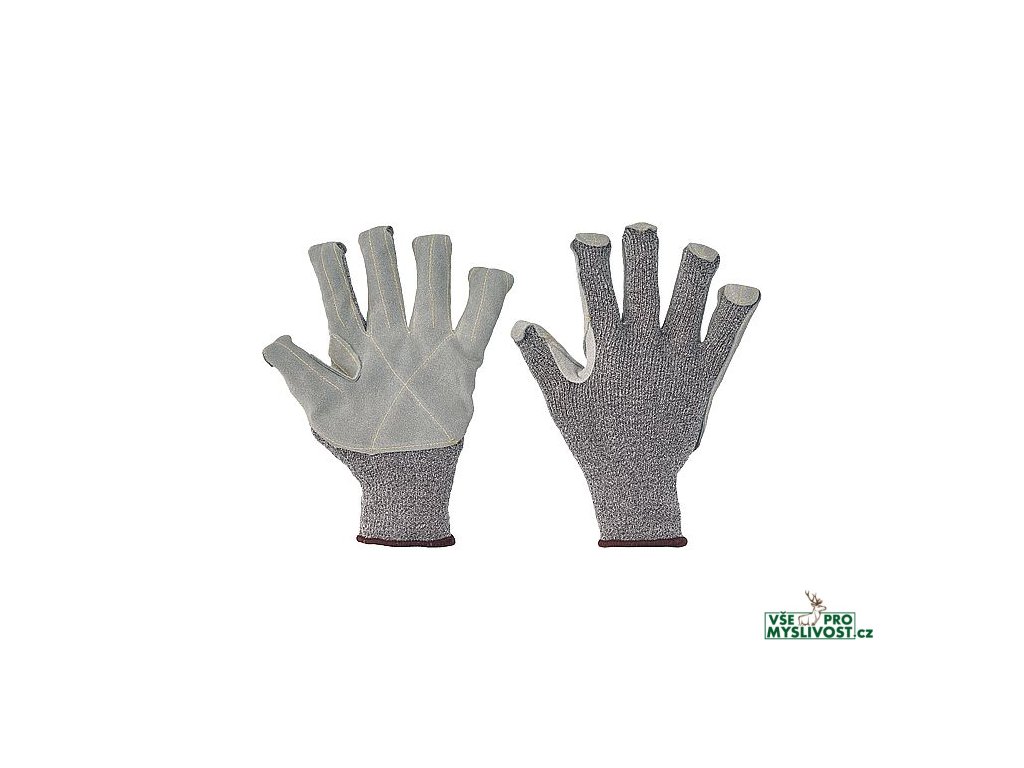 • pletené bezešvé rukavice z modifikovaného skleněného vlákna, Spandexu a nylonu • se zesílením z hovězí štípenky v dlani a na prstech • zdvojenou vrstvou mezi palcem a ukazovákem • překrytými špičkami prstů • odolnost proti prořezu kategorie E