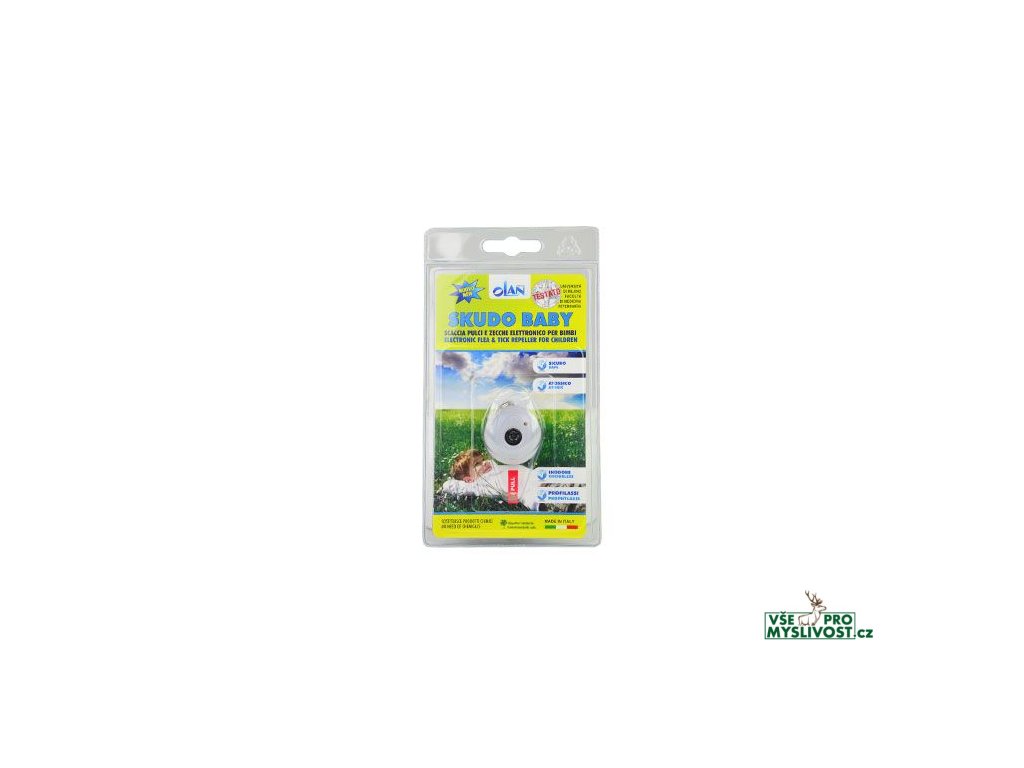 SKUDO BABY elektronický odpuzovač blech a klíšťat Bezpečný - netoxický - bez zápachu - bez chemikálií Zařízení emituje ultrazvukové impulzy rušící a odpuzující parazity o frekvenci 400MHz, které člověk ani zvíře nevnímá. Doba provozu 10měs.po aktivaci. Účinnost v okruhu 3m. Otočte vysílací zařízení směrem k tělu. Neztrácí funkčnost ve vlhku ani dešti. Aktivace:Po vytažení červené pojistky zabliká led světlo 10x a zařízení je aktivní. Napájení nevyměnitelnou litiovou baterií. Chraňte před potopením ve vodě. Neotevírat.Záruční doba 1 rok .Doplňkové parametry