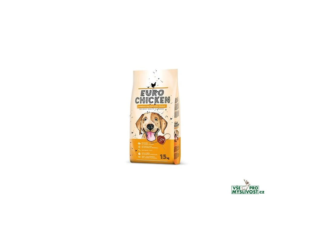Vyzkoušejte nové kompletní krmivo EUROCHICKEN s drůbežím masem pro dospělé psy všech plemen. Granule obsahují 23,5 % bílkovin a 13,5 % tuků. Mají ideální poměr vitamínů a minerálů. Obsahují jablečnou vlákninu, která podporuje správné zažívání.