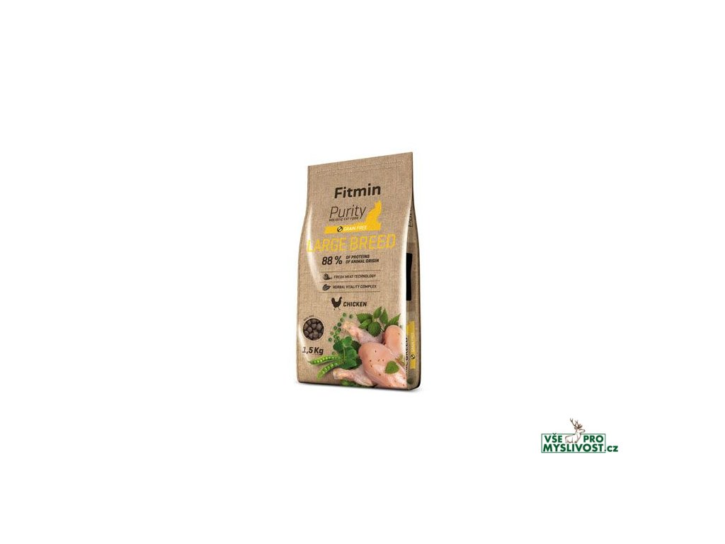 Kulinářský zážitek pro Vaši kočku. To je krmivo Fitmin cat Purity Large Breed. Jedná se o holistické granule pro velké kočky, ve kterých najdete čerstvé kuřecí maso, bylinky na podporu vitality organismu, ovoce i zeleninu. Nejenže uspokojíte mlsné jazýčky Vašich koček, ale zároveň jim poskytnete prvotřídní kvalitu. Krmivo pro velké kočky Fitmin cat Purity Large Breed je tzv. Grainfree krmivo, to znamená, že neobsahuje obiloviny, je bezlepkové, čímž snižuje potencionální riziko výskytu alergických reakcí (např. na pšeničný lepek a kukuřičný gluten). Krmivo je svým unikátním složením a velikostí granule ideální pro kočky velkých plemen jako je Mainská Mývalí kočka, Ragdoll nebo norská lesní kočka. Krmivo Fitmin cat Purity Large Breed pro velké kočky je ve tvaru větší granule, kterou kočka musí rozkousnout. Díky krmivu bude kočka ve vynikající kondici, v neposlední řadě má krmivo důležitou detoxikační funkci díky bylinné směsi, která má ovšem i mnoho dalších blahodárných účinků. Granule pro velké kočky Fitmin cat Purity Large Breed jsou vyráběny nejmodernějšími technologiemi, jsou vyvážené, obsahují vysoký podíl živočišných složek a mnoho dalších benefitů - zejména komplex dentální péče, prebiotika, cheláty a další.
