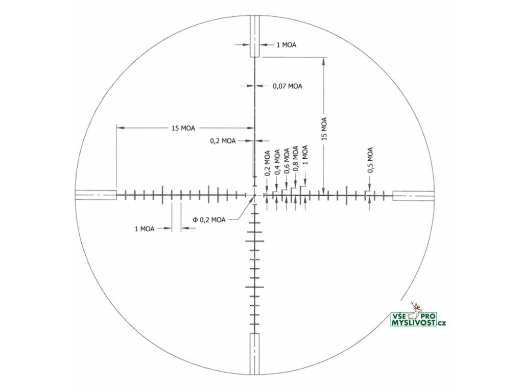 Kříž je navržen v jednotkách MOA. Síla kříže při zvětšení 24x ve 100m je 2mm.