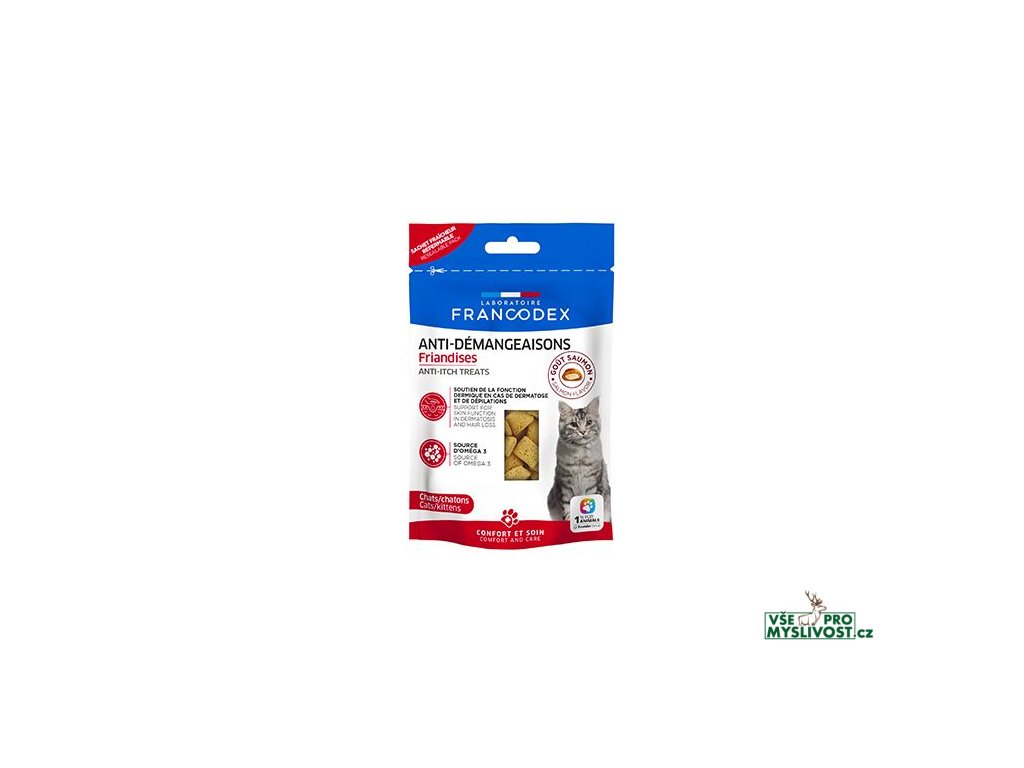 Dermatóza je kožní onemocnění, které způsobuje nepříjemné pocity, zarudnutí nebo svědění; může být doprovázeno vypadáváním srsti. Pamlsky proti svědění FRANCODEX ANTI-ITCH plní specifický nutriční cíl: „Podporovat funkci kůže při dermatóze a vypadávání srsti.“ a vyživovat kůži a srst vašeho mazlíčka.