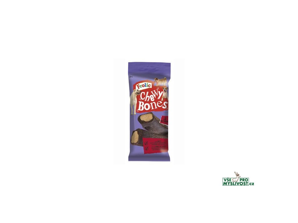 Lahodné žvýkací kosti Frolic pochoutka Chewy Bones jsou doplňkovým krmivem pro dospělé psy obsahující hovězí maso. Každá žvýkací kost poskytuje 42% denní energetické potřeby 15kg psa. Není vhodné pro psy do 8kg a štěňata do 9 měsíců. Čerstvá pitná voda musí být vždy k dispozici.