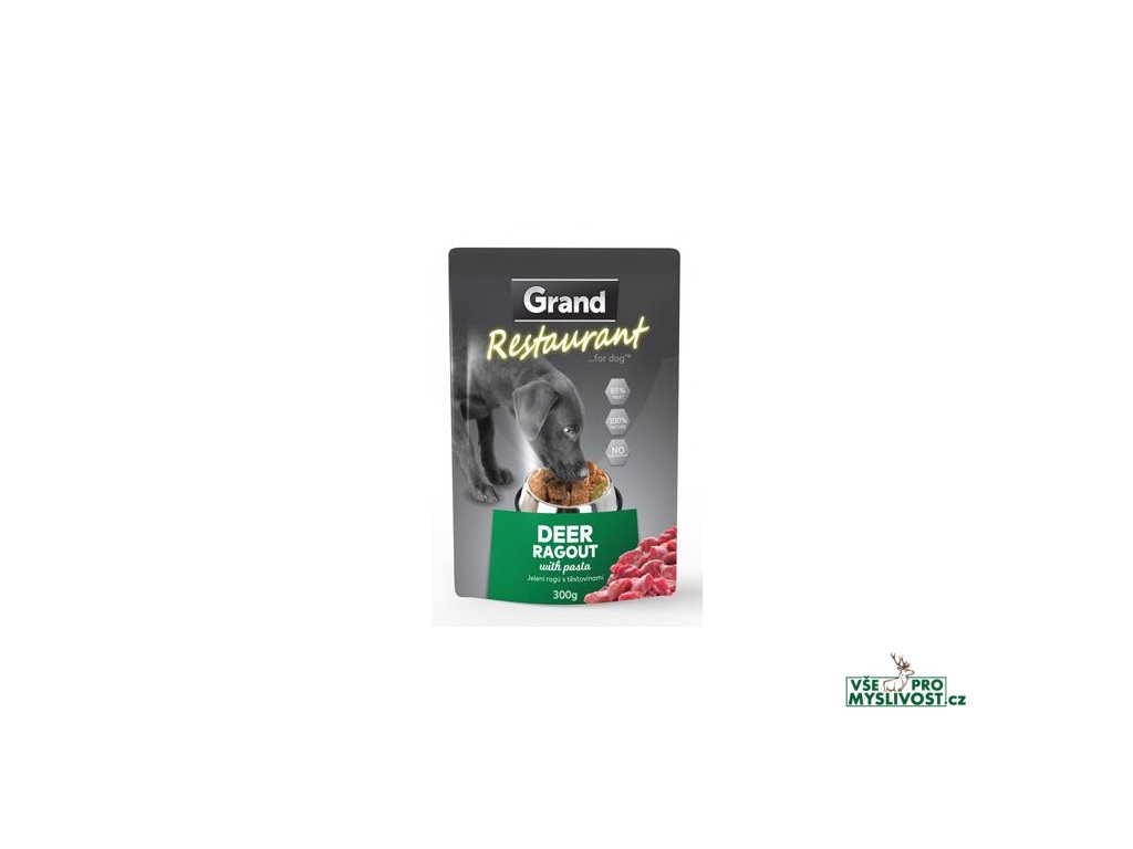 GRAND Restaurant Jelení ragú s těstovinami - kompletní vlhké krmivo pro všechny dospělé psy. Šťavnatá masová pochoutka je připravená z čerstvého jeleního masa, má pečlivě vyvážené složení pro správnou výživu organismu. Šetrný proces vaření v páře zajišťuje zachování chutnosti masa, výživových hodnot a vitamínů. Neobsahuje žádné chemické a konzervační přísady, barviva nebo dochucovadla. Pro pejsky je žádanou pochoutkou a vynikající stravou.