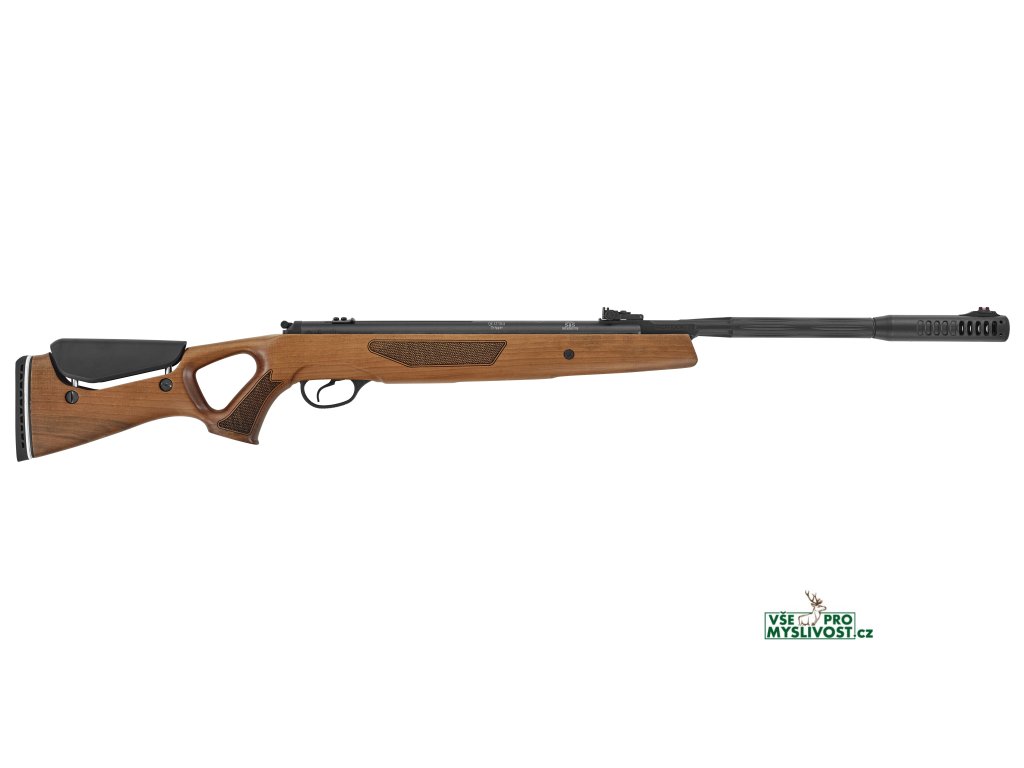 - rovná pažba z tureckého ořechu s otvorem pro palec, vše pro ergonomii střelby, zdrsnění úchopových ploch jemnou "rybí kůží", stavitelný hřbet pažby