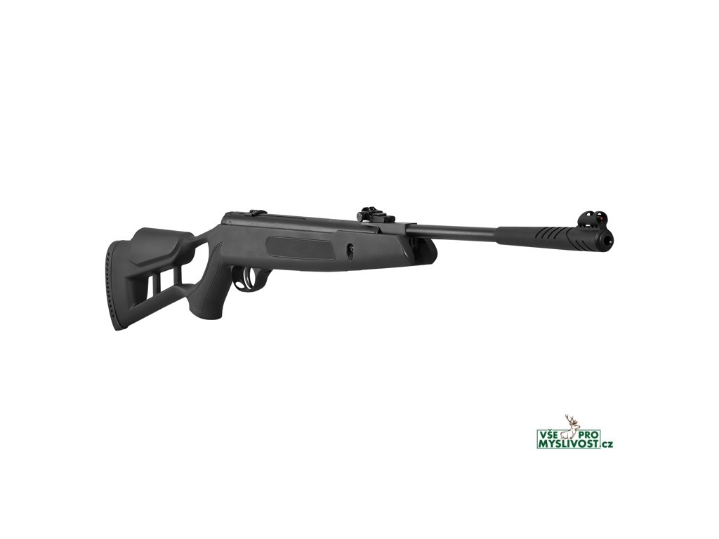 pažba Monte Carlo z šedého syntetického polymeru, perforovaná botka z černé pryže, šína 11mm s brzdou puškohledu, úsťová brzda se zabudovanou muškou, stavitelné hledí, vše světlovodná vlákna, celková délka 1100 mm, délka hlavně 450mm (úsťová rychlost 16J)