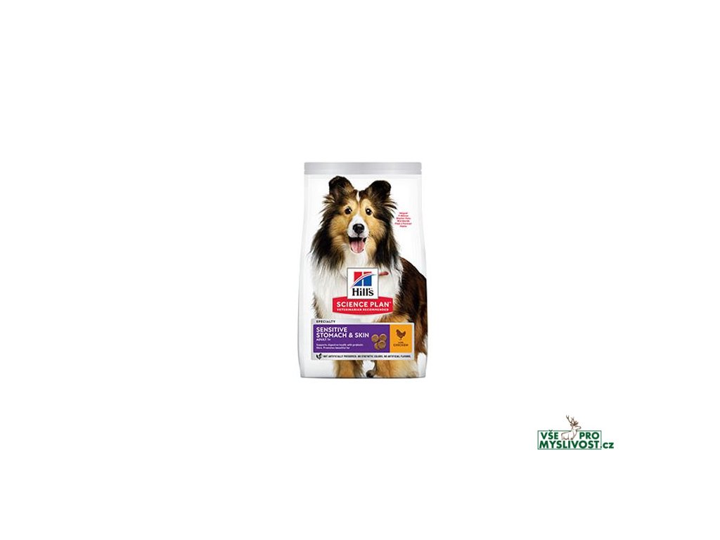 Hill's Science Plan Sensitive Stomach & Skin krmivo pro středně velké dospělé psy s kuřetem podporuje zdraví trávicího traktu díky prebiotické vláknině. Zároveň podporuje nádhernou srst.