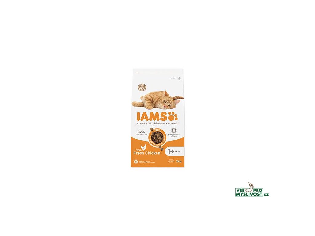 Krmivo IAMS for Vitality pro dospělé kočky je 100% kompletní a vyvážené, odborníky sestavené krmivo, které bude vašemu zvířeti chutnat a svědčit. Naše nová a vylepšená receptura pro dospělé kočky s čerstvým kuřecím masem je založena na kvalitních živočišných bílkovinách pečlivě vybraných tak, aby podporovaly sedm znaků zdravé vitality kočky. Aby byly kočky zdravé, aktivní a plné energie, obsahují naše lahodné receptury až 87 % živočišných bílkovin (z celkového obsahu bílkovin).Naším závazkem je nabídnout kočkám specializované krmivo se skvělou chutí, které si váš domácí mazlíček bezvýhradně zamiluje a které bude podporovat všech sedm znaků zdravé vitality. Díky vyváženému obsahu omega-3 a omega-6 mastných kyselin v krmivu IAMS budete moct obdivovat zdravou kůži a lesklou srst vašeho zvířete. Své receptury jsme vyvinuli tak, aby snižovaly pH v močové soustavě a udržely ji zdravou. Připravte se, že vaše zvíře bude skákat a řádit. To díky kvalitním bílkovinám a nezbytným minerálům, které pomáhají udržet zdravé svaly a klouby. Kombinace antioxidantů s vitamínem E posiluje imunitu, takže vaše zvíře už při výpravách nic neohrozí. A až ho uslyšíte chroupat naše granule s vyváženým obsahem minerálů v každém soustu, můžete si být jisti, že bude mít silné a zdravé zuby. Při úklidu kočičí toalety oceníte zdravé trávení kočky díky optimální kombinaci vlákniny, prebiotik a řepné dužiny. Naše krmiva navíc obsahují sedm základních živin pro zdravé srdce, aby vám váš miláček nikdy nepřestal projevovat lásku.
