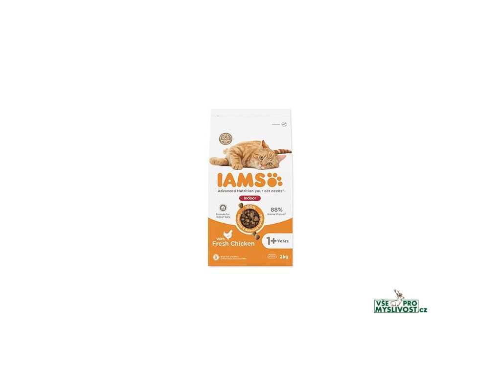 Krmivo IAMS for Vitality pro dospělé kočky a kočičí seniory žijící v bytě je 100% kompletní a vyvážené, odborníky sestavené krmivo, které bude vašemu zvířeti chutnat a svědčit. Naše nová a vylepšená receptura s čerstvým kuřecím masem je založena na kvalitních živočišných bílkovinách pečlivě vybraných tak, aby podporovaly sedm znaků zdravé vitality kočky. Aby byly kočky zdravé, aktivní a plné energie, obsahují naše lahodné receptury až 89 % živočišných bílkovin (z celkového obsahu bílkovin). Naše receptura pro kočky chované v bytě dokonale přispívá k zachování štíhlé a zdravé tělesné stavby.Naším závazkem je nabídnout kočkám specializované krmivo se skvělou chutí, které si váš domácí mazlíček bezvýhradně zamiluje a které bude podporovat všech sedm znaků zdravé vitality. Oproti našemu běžnému krmivu IAMS pro dospělé kočky s čerstvým kuřecím masem obsahuje tato receptura o 14 % méně tuku pro zachování štíhlé tělesné stavby a zdravé kondice. Díky vyváženému obsahu omega-3 a omega-6 mastných kyselin v krmivu IAMS budete moct obdivovat zdravou kůži a lesklou srst svého zvířete. Své receptury jsme vyvinuli tak, aby snižovaly pH v močové soustavě a udržely ji zdravou. Připravte se, že vaše kočka bude skákat a řádit. To díky kvalitním bílkovinám a nezbytným minerálům, které pomáhají udržet zdravé svaly a kosti. Kombinace antioxidantů s vitamínem E posiluje imunitu, takže ji už při výpravách nic neohrozí. A až ji uslyšíte chroupat naše granule s vyváženým obsahem minerálů v každém soustu, můžete si být jisti, že bude mít silné a zdravé zuby. Při úklidu kočičí toalety oceníte zdravé trávení kočky díky optimální kombinaci vlákniny, prebiotik a řepné dužiny. Naše krmiva navíc obsahují základní živiny, jako např. taurin, pro zdravé srdce, aby vám váš miláček nikdy nepřestal projevovat lásku.