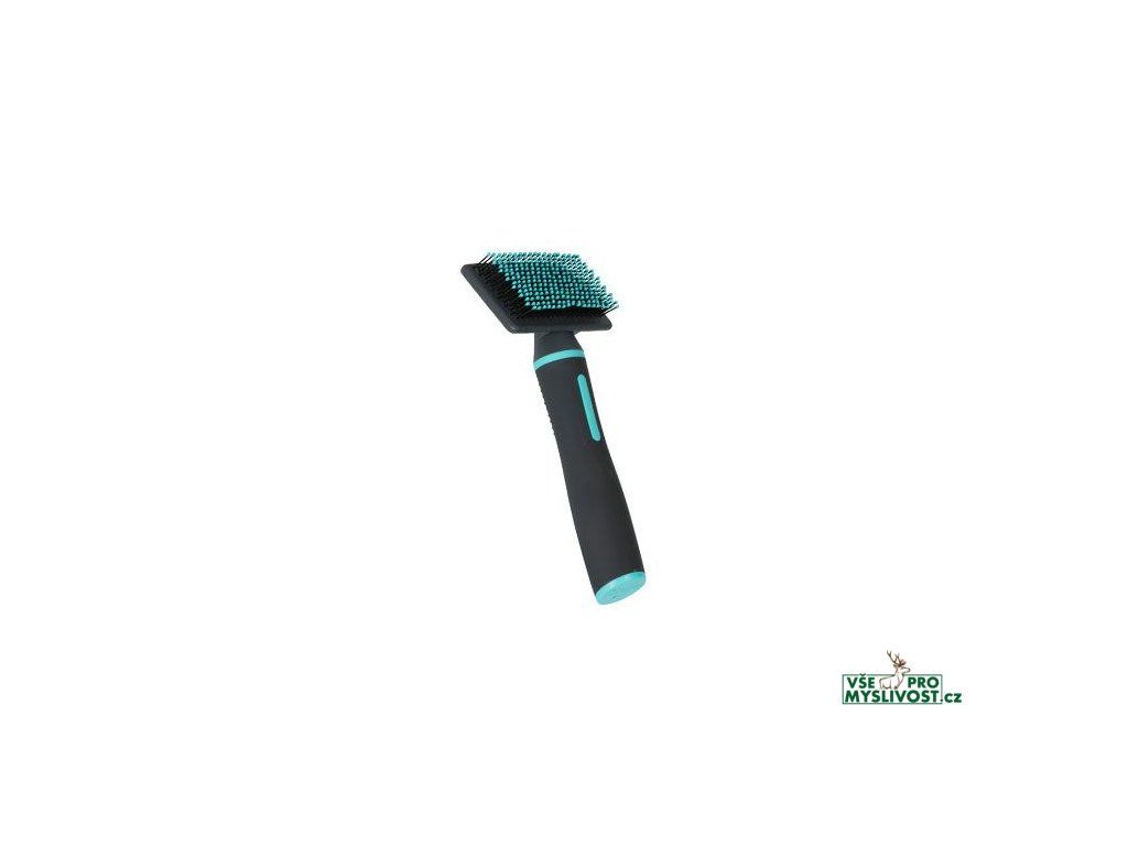 Jemný rozčesávací kartáč s jemnými štětinami pro psy na středně dlouhou a dlouhou srst. Rozčesává, odstraňuje uvolněné chlupy a vyhlazuje srst.- Díky svým pružným hrotům s plastovými konci, které jsou pro vašeho psa jemnější, se používá pro jemné vyčesávání spodní vrstvy srsti.