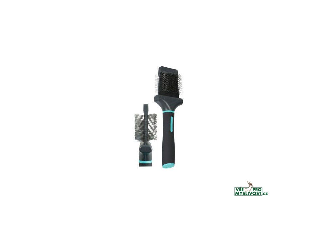 Pružný oboustranný rozčesávací kartáč pro psy na všechny typy srsti. Rozčesává, odstraňuje uvolněné chlupy a vyhlazuje srst.- Díky svým dlouhým a pružným hrotům se používá pro vyčesávání spodní vrstvy srsti.