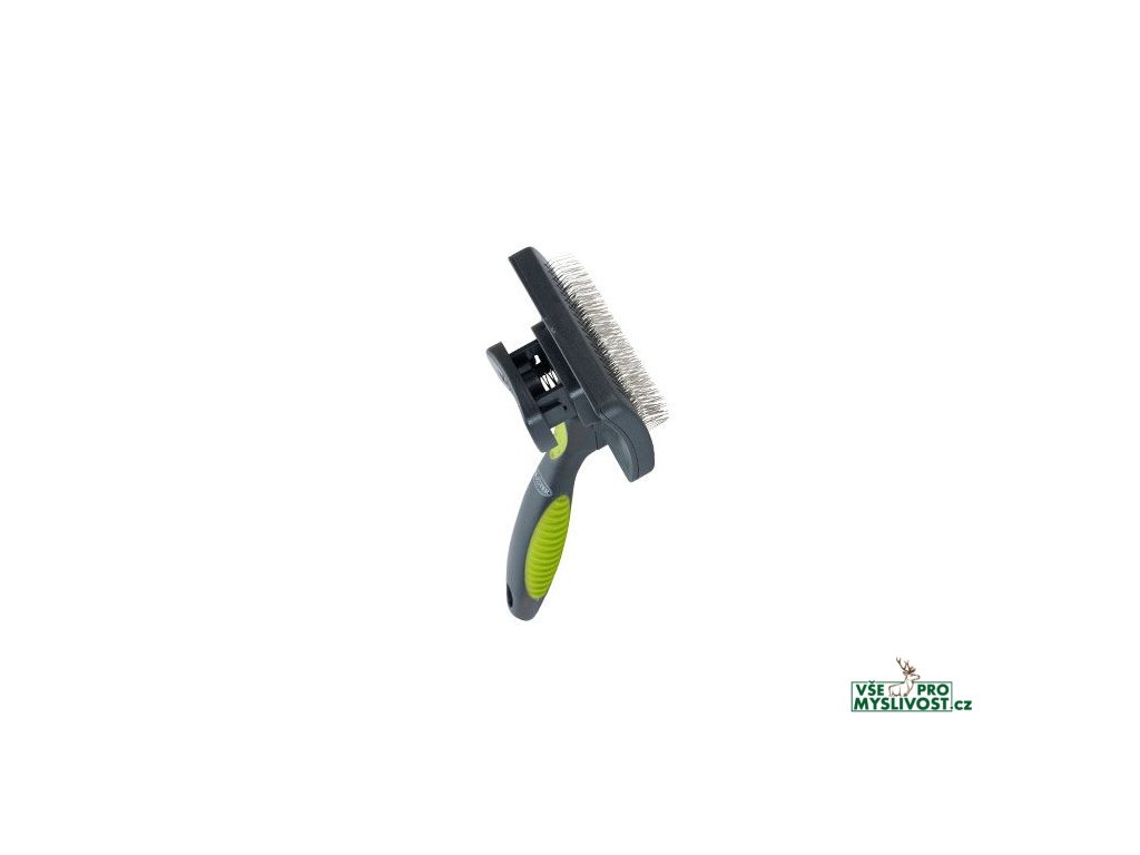 BUSTER samočisticí slicker - Slicker Brush je jemný a účinný víceúčelový pečující nástroj pro odmaštění a odstranění nechtěných vypadávajících chloupků - Zasouvací kolíky vám ušetří drahocenný čas na čištění - Když je podložka plná, uvolněte chloupky stisknutím tlačítka zadní strana vložky - Pro dlouhé/silné/dvojité pláště