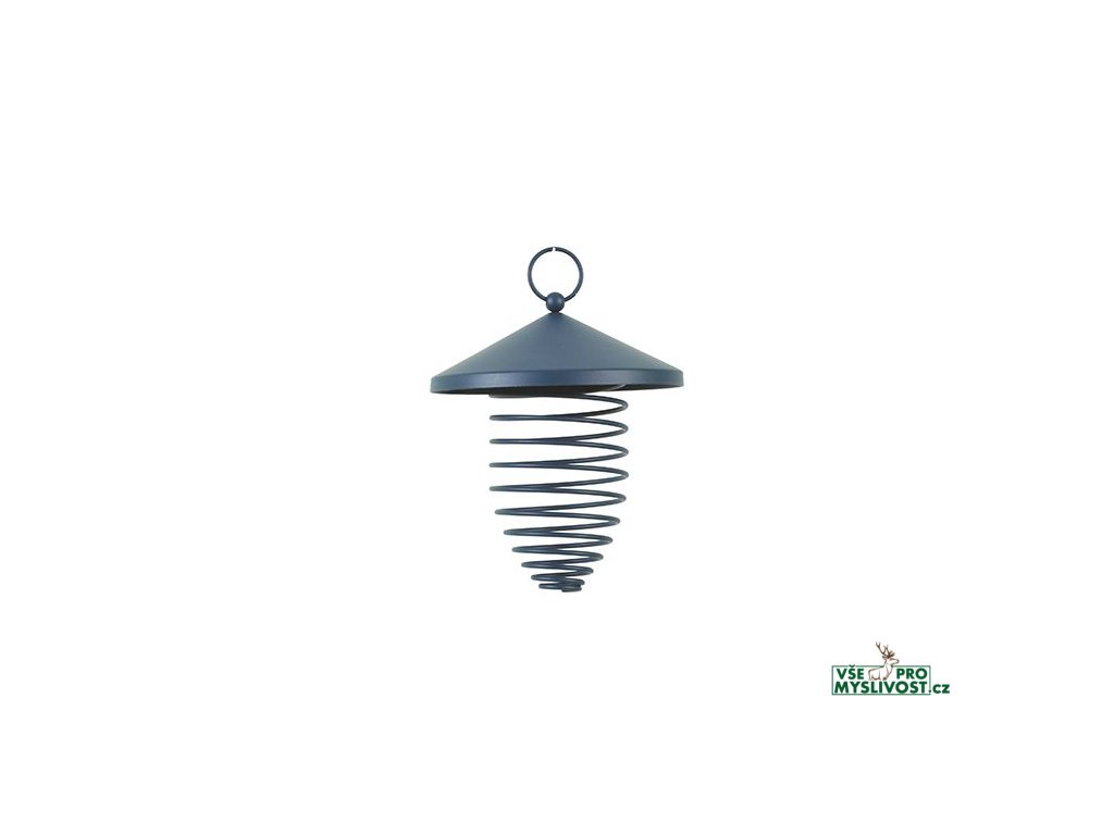 Závěsné kovové krmítko ve tvaru spirály na 2 lojové koule, se stříškou. Výška spirály 11cm. Dodáváno bez koulí.