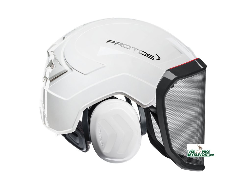 Profesionální lesnická pracovní přilba Protos® Integral Forest v bílém provedení je určena pro práce v lese, práce s motorovou pilou, pro stromolezce a arboristy. Protos Forest je vhodná zejména pro kácení. Je lehká, pohodlná a velice komfortní. Všechny součásti ochrany hlavy jsou integrovány do přilby, od štítu až po ochranná sluchátka a nehrozí tak jakékoliv zadrhnutí či uvíznutí ve větvích. Vysoký komfort při každodenním nošení zajišťují měkké polštářky uvnitř, které lze snadno vyjmout, vyprat či vyměnit za nové. Všechny součásti perfektně přilnou k hlavě, jsou variabilní a snadno se upevňují. Proto je přilba vhodná i do extrémního počasí a odolává dešti, pilinám a prachu. Velikost přilby je univerzální a dá se snadno nastavit.Protos® Integral Forest je nabízen jako komplet se sluchátky a ochranným štítem F39 (39 otvorů / cm2).Protos® Integral Forest je certifikován podle EN 397, EN 352-3 a EN 1731.