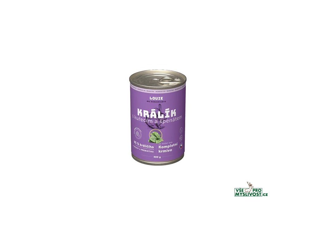 Kompletní krmivo bez obilnin pro psy každého věku i plemene, králík s kuřecím a špenátem. Nabízí Vašemu miláčkovi možnost stravy z kvalitního masa (95 % v pevné složce). Pro podporu peristaltiky střev a simulaci minoritní rostlinné složky v potravě psů slouží příměs špenátu. Krmivo neobsahuje žádné konzervanty, dochucovadla ani barviva, pouze 95 % masa, špenát, vitamíny a minerály.