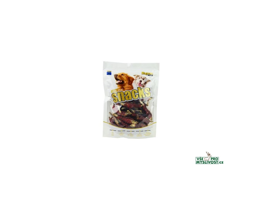 Měkká, přírodní masová pochoutka pro psy. Sušené rybky omotané proužkem kachní svaloviny.Slouží jako odměna při hře, výcviku nebo jako doplněk stravy při cestách.
