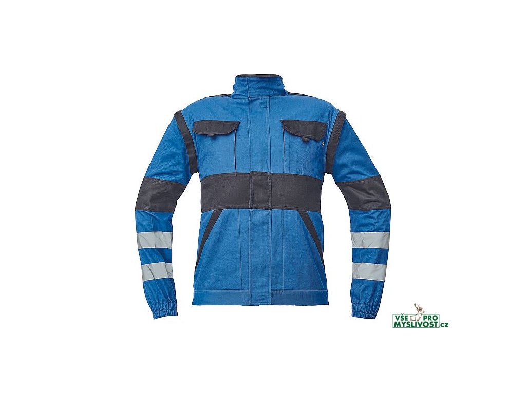 • pánská pracovní bunda se zapínáním na zip krytým légou • odepínatelné rukávy • 2 přední kapsy • 2 náprsní kapsy • zesílení namáhaných míst loktů a ramen • reflexní pruhy po odvodu rukávů a ve spodní části zad • pružné manžety rukávů a spodní obvod v pase