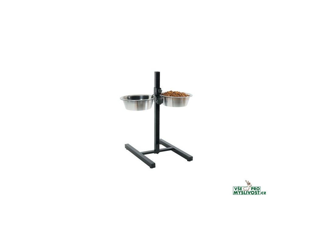 Stojan na misky v černé barvě. Dvě misky 1,5l jsou součástí balení.Nastavitelný stojan je vhodný pro střední plemena.
