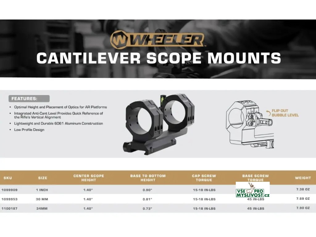 WHEELER Cantilever Scope Mount je vysoce kvalitní montážní základna navržená speciálně pro pušky na platformě AR-15. Díky Cantilever konstrukci umožňuje puškohled upevnit dále dopředu na tělo zbraně, což je klíčové pro dosažení optimální vzdálenosti oka od optiky (eye relief).