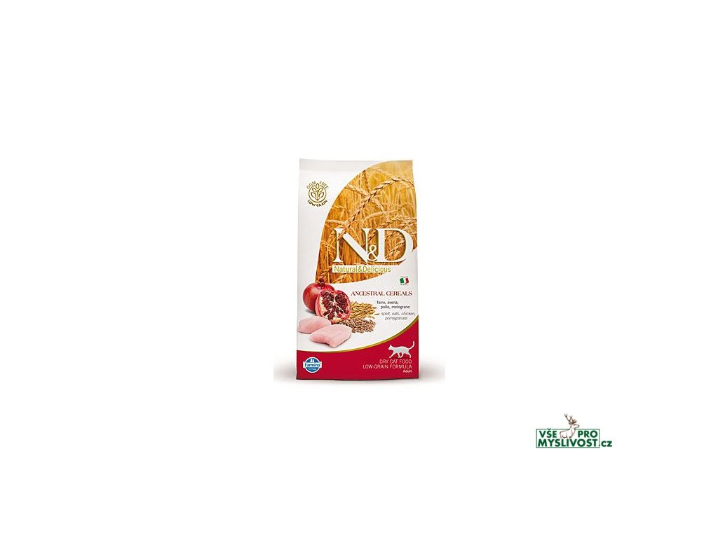 N&D Low Grain Chicken & Pomegranate Adult CatKuře, špalda, oves a granátové jablko.