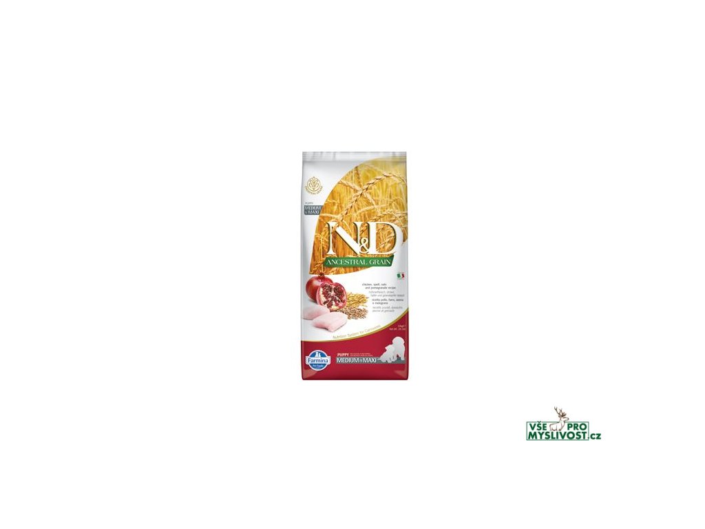 N&D Low Grain Chicken & Pomegranate Puppy M/L DogKuře, špalda, oves a granátové jablko.