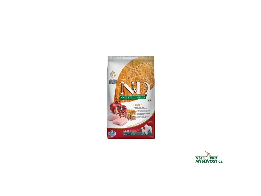 N&D Low Grain Chicken & Pomegranate Light M/L DogLIGHT - Kuře, špalda, oves a granátové jablko.