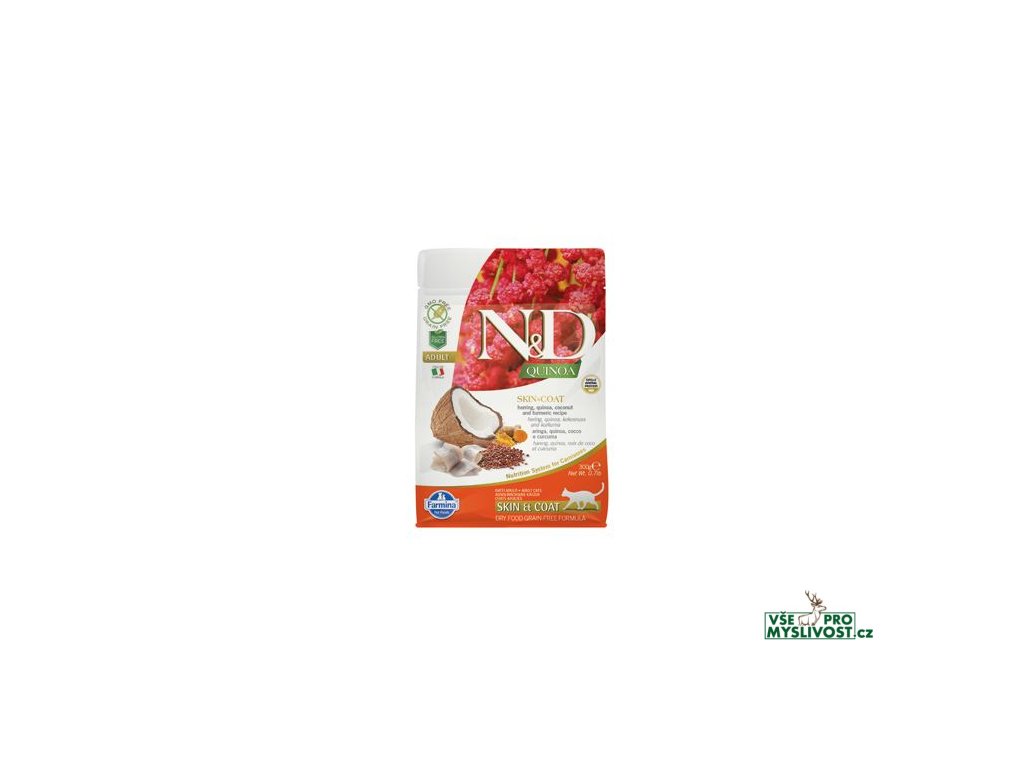 Farmina N&D Quinoa Skin & Coat je krmivo pro zvláštní účely výživy koček určené k podpoře omezení intolerance určitých komponentů a živin.