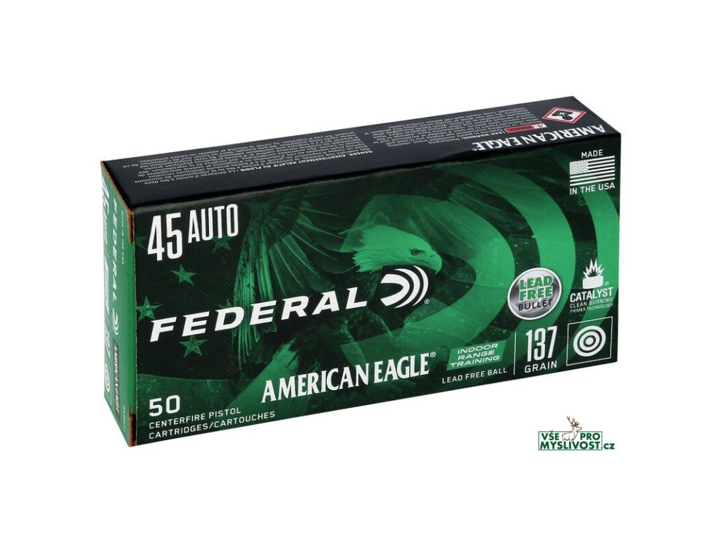 Výstřel nebyl niíkdy tak čistý. Střelivo American Eagle - Indoor Range Training IRT již dlouhou dobu pomáhá střelcům minimalizovat olovo na palebné čáře. N8boj se zápalkou Federal Catalyst (lead - free) ve spojení s bezolovnatými střelami nabízí stejnou spolehlivostě a balistiku jako konvenční náboj. Nábojnje vhodný pro terčovou střelbu.