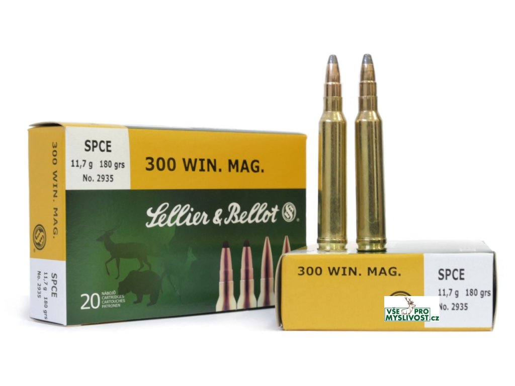 SB 300 Win Mag 2935 SPCE 11,7g Poloplášťová střela s prosekávací hranou. Střela má na plášti prosekávací hranu, která současně z části uzamyká olověné jádro. Účinek střely je závislý na odporu cíle, což způsobuje, že u slabší zvěře se střela deformuje méně než u silnější. Je vhodná k lovu spárkaté zvěře.