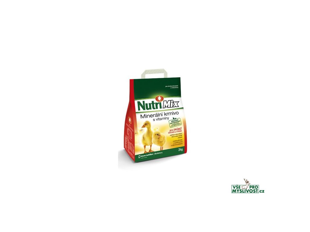 Minerální krmivo s vitaminy pro výkrm a odchov drůbeže. Vitamino-minerální směs NUTRI MIX je určena pro drobnochovatele a malochovy. Přidává se do krmné dávky drůbeže, kterou tvoří převážně obilné šroty, kuchyňské zbytky a další domácí krmiva. Obsahuje biologicky účinné látky – vitamíny, minerální látky a aminokyseliny. Tato směs umožňuje chovatelům dokompletovat neplnohodnotnou krmnou dávku na potřebnou úroveň a zajistit tak zlepšení příjmu a využitelnosti krmiva, zvýšení přírůstků a udržení dobrého zdravotního stavu mladé drůbeže.