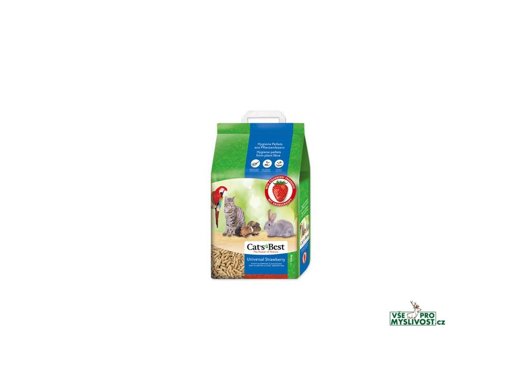 Cat's best Universal jahoda je víceúčelovou podestýlkou pro kočky, hlodavce, malá domácí zvířátka chovaná v kleci. Podestýlka je čistě přírodní produkt, který dobře pohlcuje zápach a zároveň má vysokou absorbční schopnost. Kompletně podléhá rozkladu. Jedná se o nehrudkující stelivo s jahodovou vůní.Má vynikající absorpční vlastnosti. Je vhodná pro kočky, štěňata, exotické ptactvo, hlodavce, terarijní zvířata a další zvířata chovaná v klecích a teráriích.