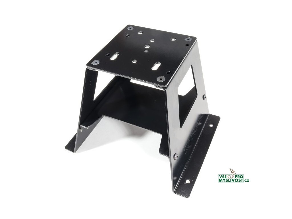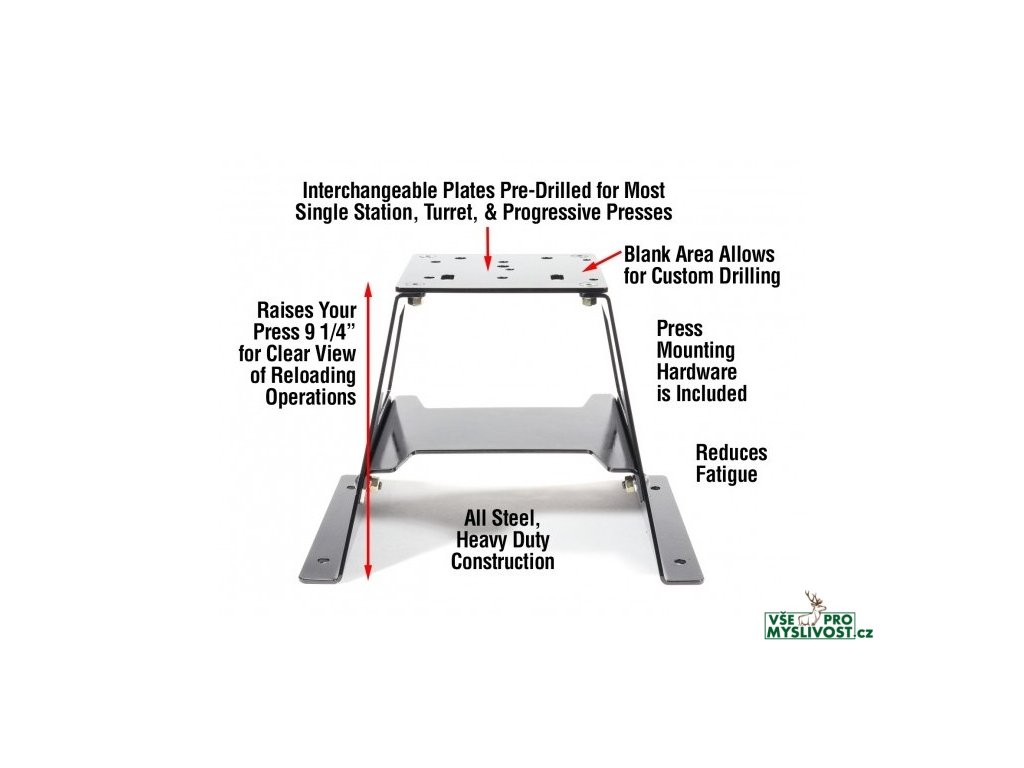 Tento těžký ocelový stojan je dodáván se dvěma montážními deskami s předem vyvrtanými otvory pro Váš přebíjecí lis. Pro montáž Vašeho lisu buďto využijete předvrtané otvory, nebo můžete vyvrtat své vlastní. Stojan zvedne váš lis o 23 cm nad přebíjecí stůl, nemusíte se tedy ohýbat k nízkému stolu, a máte snadný dohled nad všemi operacemi přebíjení.