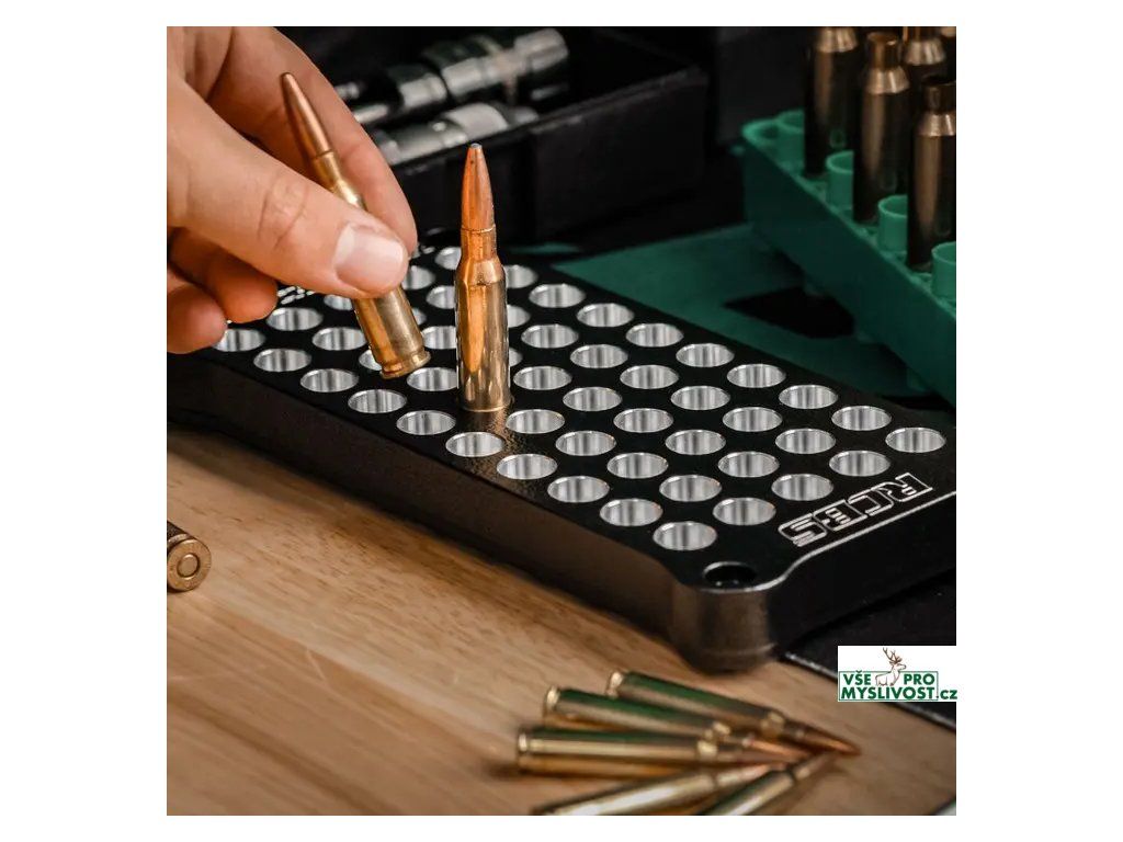 Praktické průchozí otvory umožňují, aby případně vysypaný střelný prach propadl skrz blok, což výrazně usnadňuje čištění. Protiskluzové nožičky zajišťují stabilitu při práci a zabraňují pohybu bloku během manipulace s nábojnicemi.
