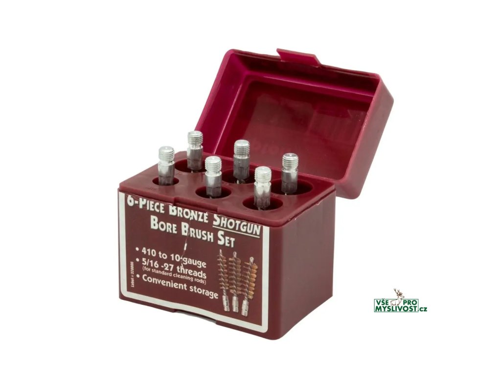 - 6dílná sada kalibrově specifických kartáčků pro čištění vývrtu hlavně brokovnic - Bronzové štětiny z fosforového bronzu - Závit 5/16"-27 – kompatibilní s většinou brokovnicových tyčí - Odolná krabička s přihrádkami označenými podle kalibru