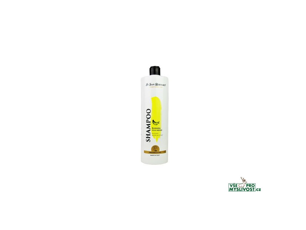 ŠAMPON BANÁNOVÝ - pro psy a kočky se středně dlouhou srstí Šampon pro běžné mytí s obsahem banánového extraktu pro psy a kočky se středně dlouhou srstí.Má svěží vůni, tvoří bohatou pěnu a zajišťuje hydrataci kůže. Jeho účinek vychází z toho, že psi a kočky se středně dlouhou srstí obsahují více podsady.Jeho složky napomáhají zajištovat lesk a elasticitu srsti.Použití:Vodou sprchujte srst a kůži psa nebo kočky dokud nejsou dokonale namočené.Šampon nařeďte 1:3 a jemně vmasírujte do srsti celého povrchu těla.Šampon po umytí spláchněte hojným množstvím vody.Doplňkové parametry
