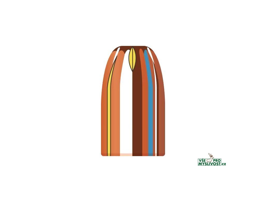 Plášť chrání špičku střely, aby dutina při nárazu správně fungovala, zatímco rovnoměrná hustota jádra zajišťuje vyváženou expanzi a stabilitu za letu.